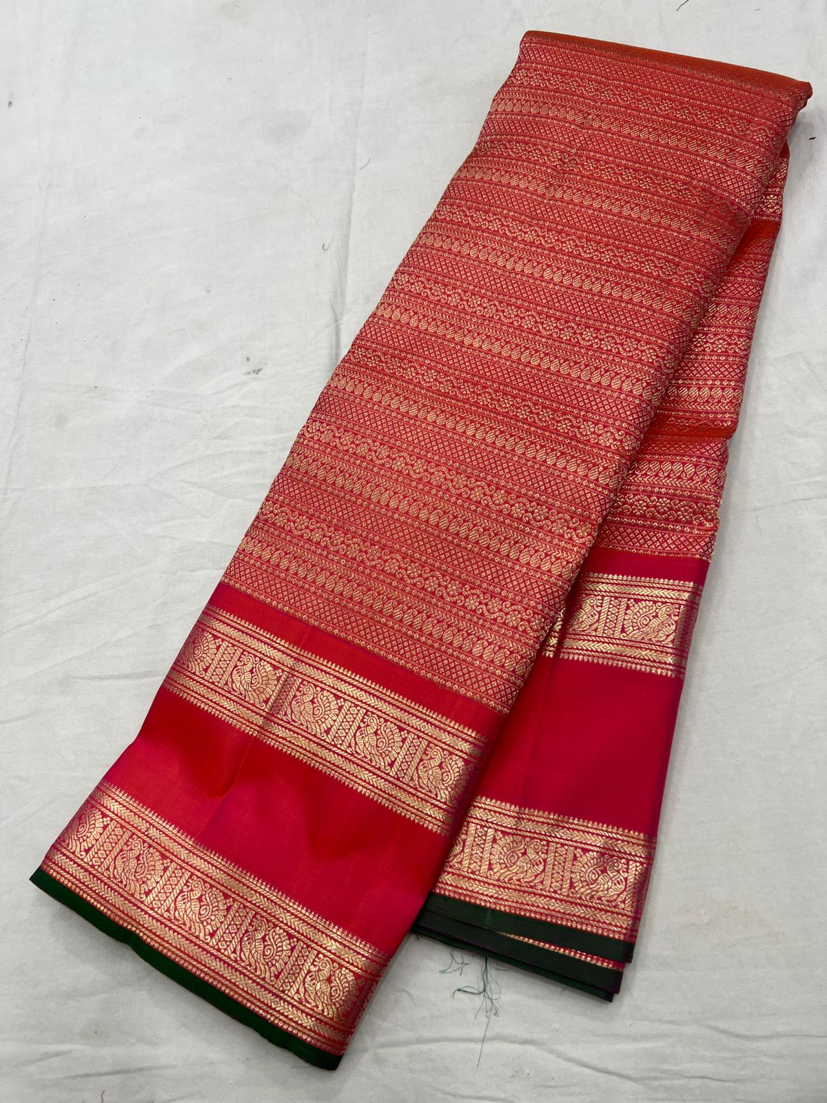 Typically woven from pure mulberry silk, Dharmavaram bridal sarees are not just luxurious but also durable — making them perfect heirlooms to pass down through generations. The heavy pallus and broad borders symbolize prosperity and celebration, making them ideal for weddings and festive occasions.